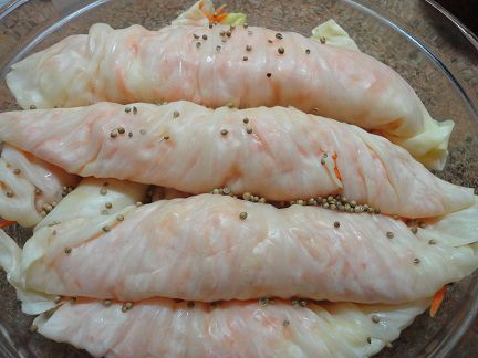 Завернуть рулетики и уложить в стеклянную или эмалированную посуду. Посыпать кориандром.