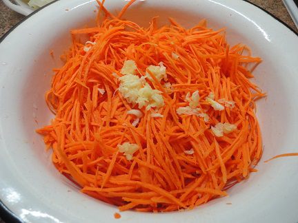 Морковь натереть (лучше на корейской терке) и смешать с натертым чесноком.
