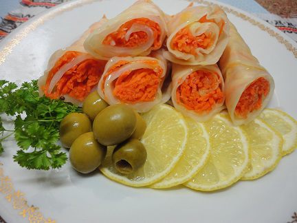 Эти рулетики — отличное дополнение к мясному блюду. Да и сами по себе они самодостаточны — хрустящие, ароматные. Можно и на праздничный стол поставить. После дегустации поняла, что надо было бы к моркови нашинковать перчик чили. Учтите это на будущее.