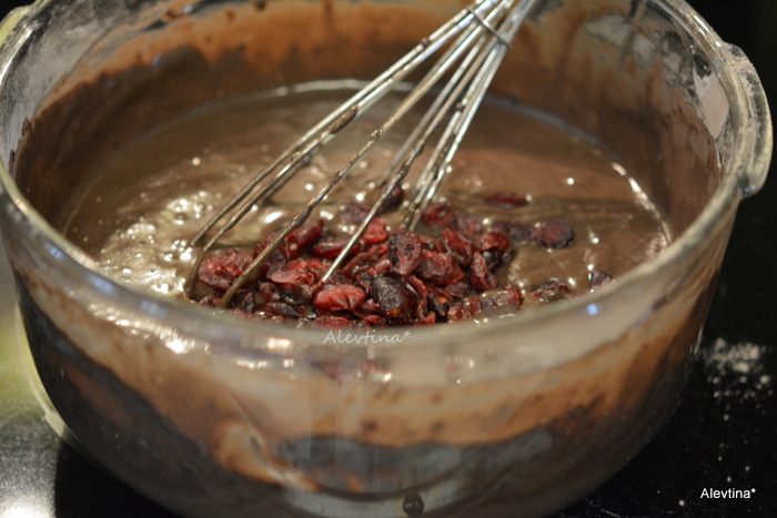 Отложить 3/4 чашки теста в одну из приготовленных форм — корж пойдёт на обсыпку торта. Добавить сухую клюкву к остальному тесту, перемешать.