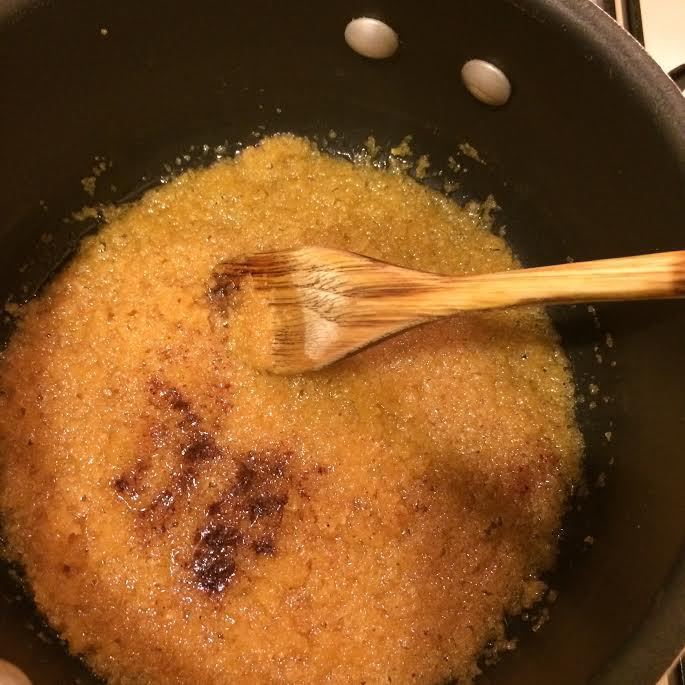 Духовку нагреть до 165°С. Форму (диаметр 20 см) слегка смазать маслом. Начинка: на медленном огне растопить сливочное масло, добавить сахар, перемешать и дать закипеть. Снять с огня, добавить корицу и перемешать.