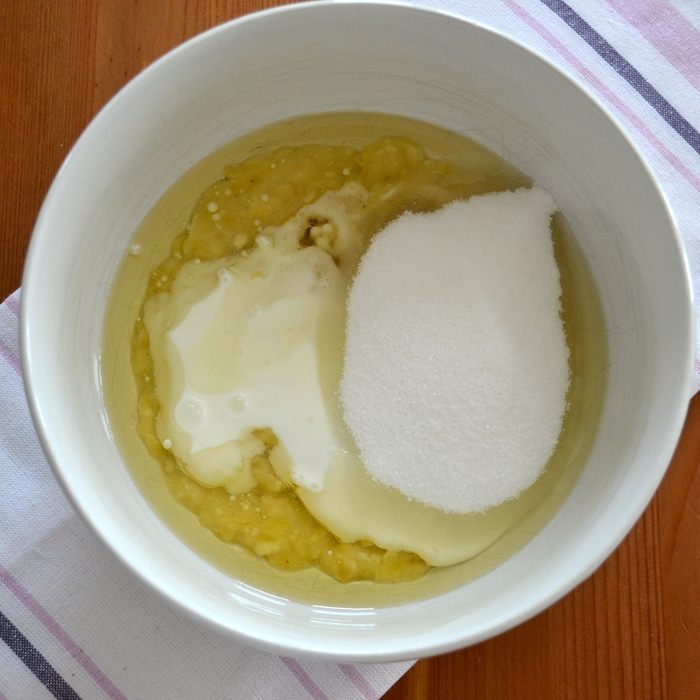 К банановому пюре добавьте кефир, растительное масло, сахар и перемешайте.
