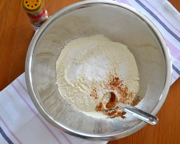 Отдельно в миске смешайте все сухие ингредиенты: просеянную муку, соду, соль и корицу.