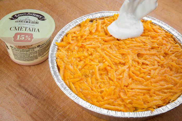 Закрыть его тыквенно-яичной смесью и промазать сметаной.