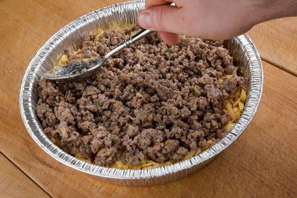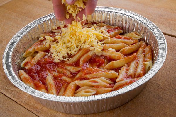 Смазать форму маслом. На дно уложить слой макарон, смазать его томатной пастой и слегка присыпать сыром.
