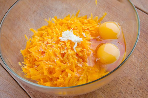 Сыр натереть. Взбить яйца и смешать с их тыквой. Добавить немного соли и давленный чеснок. Сыр — важный ингредиент в таком блюде, как запеканка. Попробуйте использовать сыр "Брест-Литовск", и результат вас приятно удивит!