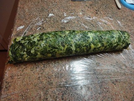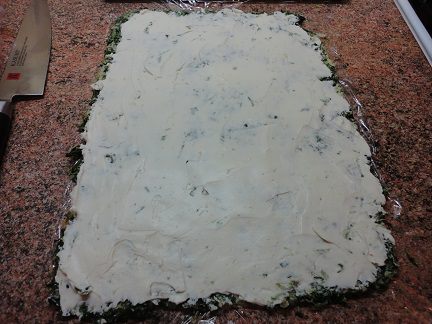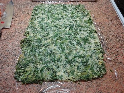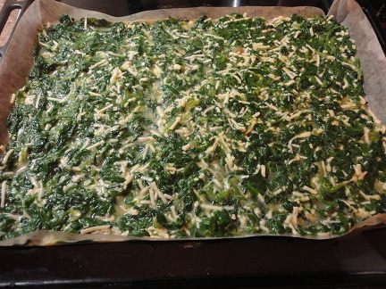 Шпинат разморозить в дуршлаге, дать стечь жидкости, можно даже слегка отжать. Сыр (любой твердый) натереть на мелкой терке. Яйца взбить с солью, поперчить и смешать все ингредиенты. Противень выстлать бумагой (примерно 28х38 см), смазать ее растительным маслом. Я недостаточно отжала шпинат, и масса получилась жидковатой, поэтому пришлось все четыре уголка скрепить степлером и таким образом сформовать небольшие бортики. Вылить смесь, разровнять и выпекать в духовке 10 минут при температуре 200°С. Остудить на бумаге.