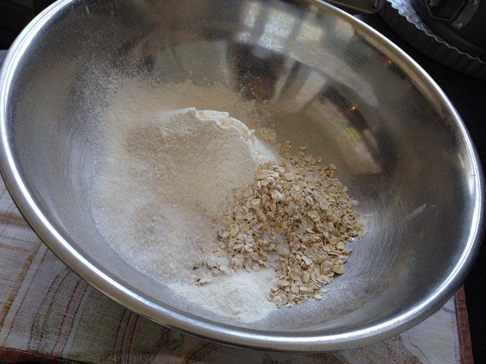 В миске смешать муку, овсяные хлопья, сахар, разрыхлитель и щепотку соли.