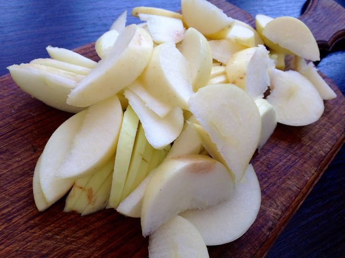 Яблоки вымыть и нарезать тонкими дольками.