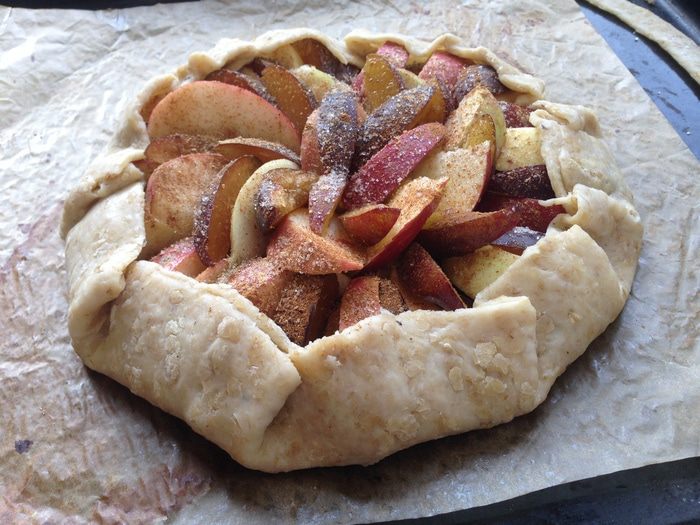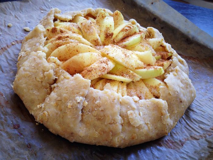 Присыпать яблоки сахаром, корицей и имбирем. Края теста завернуть внутрь, сформировав галету.