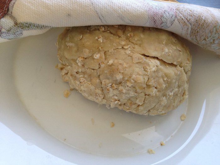В чашке смешать оливковое масло и кипяток. Вылить воду с маслом в сухую смесь и вымешать тесто (при необходимости добавить или кипяток или муку, смотрите на качество своей муки). Оставить тесто под полотенцем 20-30 минут.