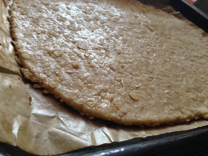 На присыпанной мукой рабочей поверхности тесто раскатать в пласт толщиной 5мм. Потом аккуратно перенести на противень застеленный бумагой для выпечки.