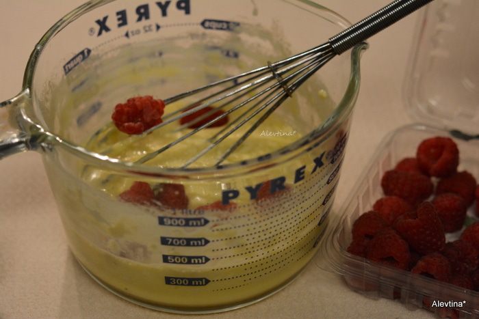 Добавить муку, перемешать без усердия, затем ягоды по желанию.