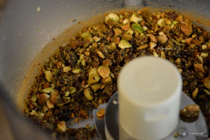 Добавить половину порции очищенных и порубленых фисташек, вяленую вишню 1 стакан, можно заменить на вяленую клюкву.