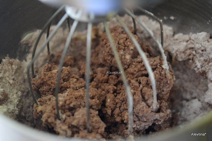 Отдельно смешать муку, какао, пищевую соду, соль. Добавить это в маслянную смесь и перемешать.