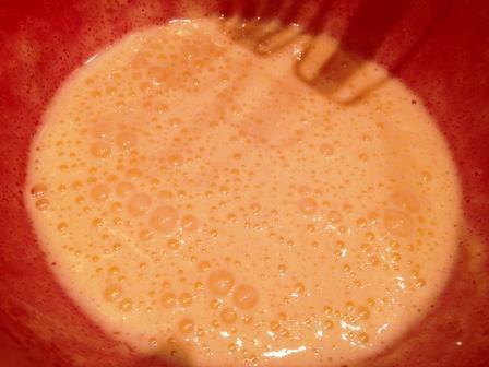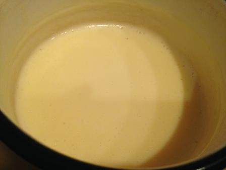 Когда молоко начнет закипать, влить примерно 1/3 его тонкой струйкой в яичную массу, перемешать.