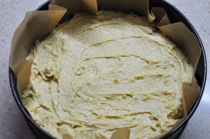 Выложить тесто в разъемную форму, устланную пергаментом. Смазывать не нужно форму.