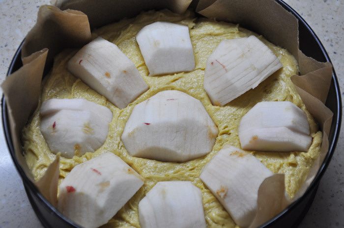 Яблоки очистить, нарезать крупными кусками без косточек. Сделать продольные надрезы на выпуклой стороне. Выложить на тесто.
