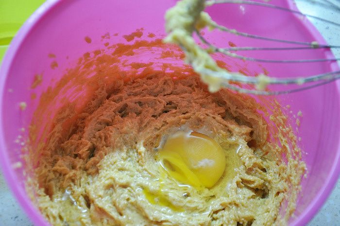 Масло комнатной температуры взбить с сахаром до получения однородной массы. Сахар не должен раствориться полностью.