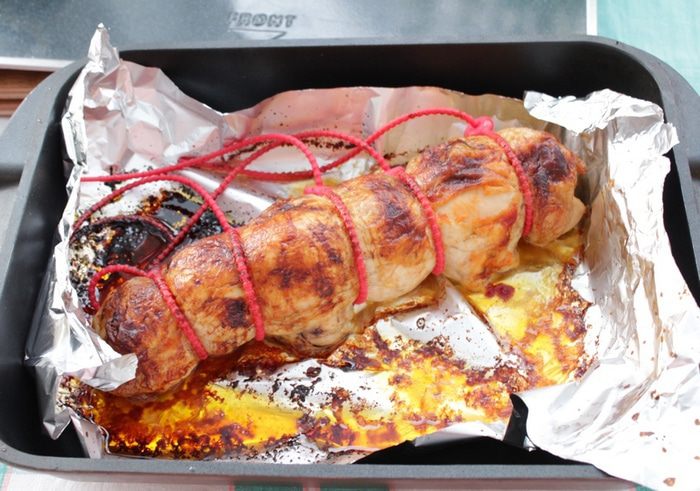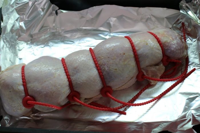 Удалите кончики крыльев. Курицу разрезать вдоль хребта, аккуратно удалить косточки вместе с хребтом. Полностью распластайте тушку. Разрежьте грудки вдоль и разверните как книжки, чтобы равномерно заполнить те места, где мяса меньше. Накройте тушку слоем пленки и отбейте молотком, чтобы выровнять поверхность. Затем посыпьте курицу солью и перцем.