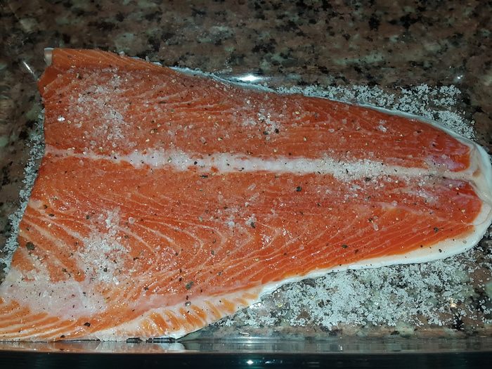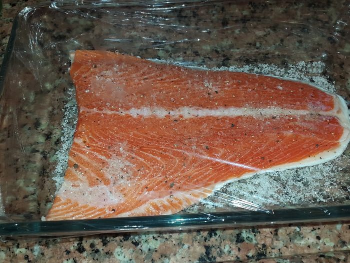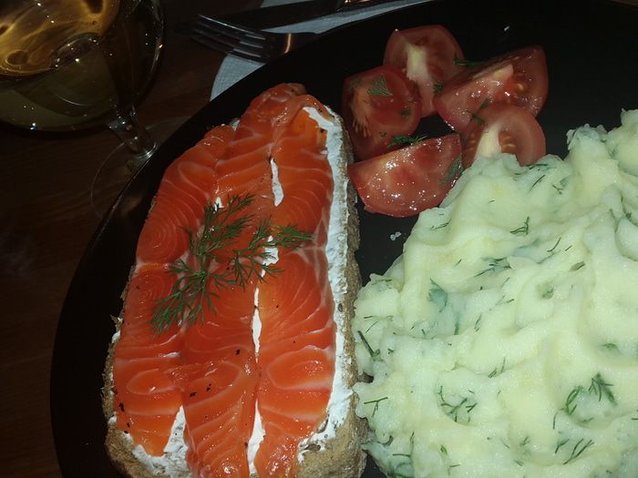 Подсушить черный хлеб в духовке, намазать сыром маскарпоне (у меня лабне), выложить сверху ломтики лосося, украсить зеленью.
