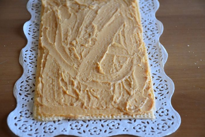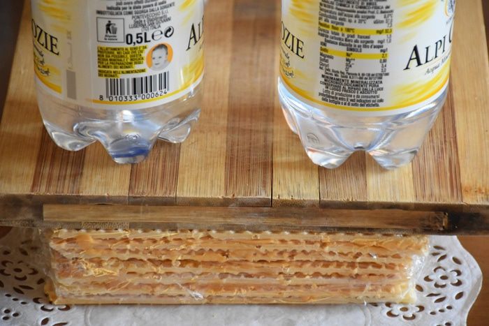 Торт накрыть пищевой пленкой, сверху поставить груз и отправить в холодильник на 2 часа.