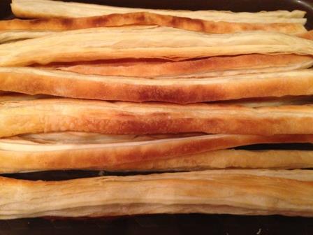 Тесто разморозить, разрезать на полоски 1 см и испечь.