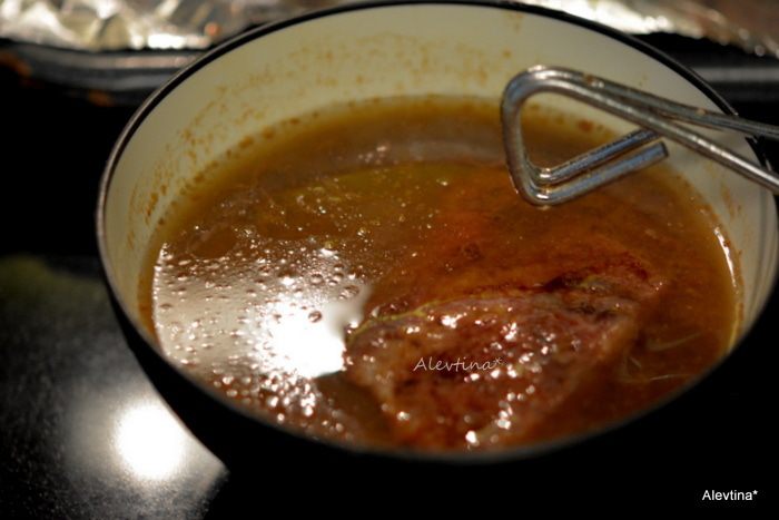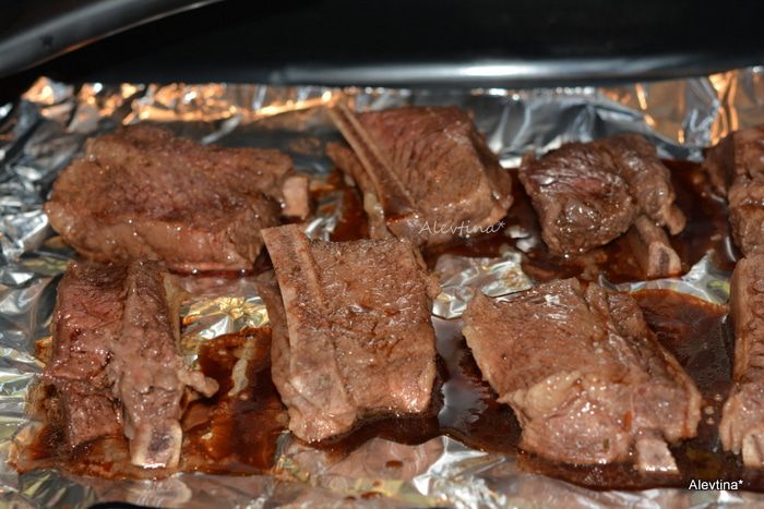 Выкладывать ребрышки на противень застеленный фольгой. Поставить в разогретую духовку на 180°С, прикрыв фольгой сверху на 2 часа. Каждый час или полчаса поливать смесью и переворачивать ребрышки.