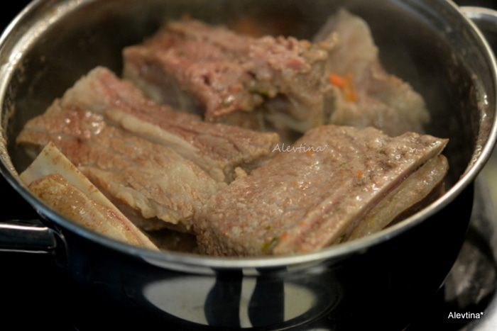 Выложить ребра в кастрюлю, залить водой, поставить на огонь, закрыть крышкой и варить примерно 25 минут до розового цвета. Затем снять с огня и воду слить.