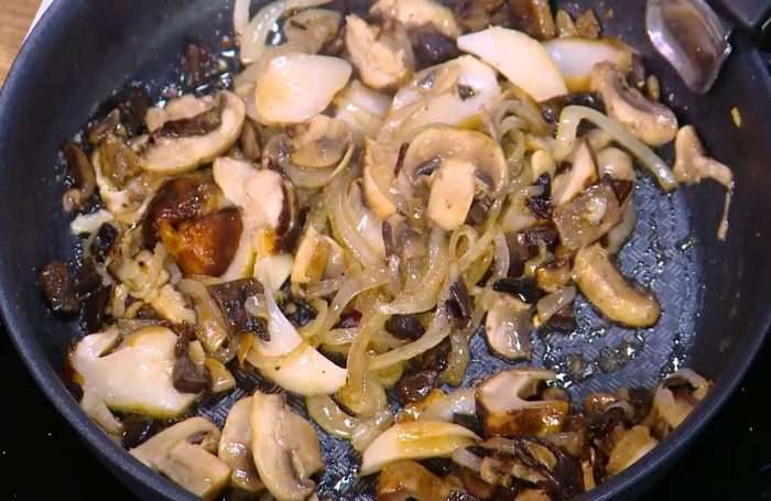 Добавить шампиньоны и сухие грибы к луку с чесноком, слегка посолить, поперчить, перемешать и обжарить.