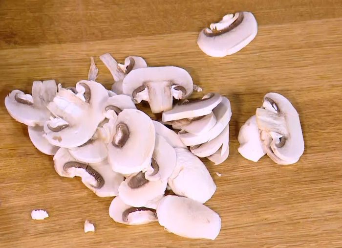 Размороженные белые грибы нарезать пластинками, добавить в сковороду, все перемешать.