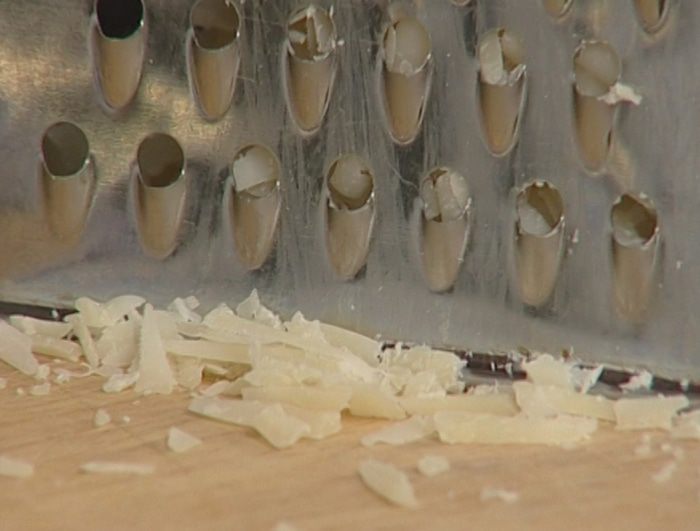 На яйца чайной ложкой выложить небольшие кусочки сливочного сыра и посыпать все натертым твердым сыром.
