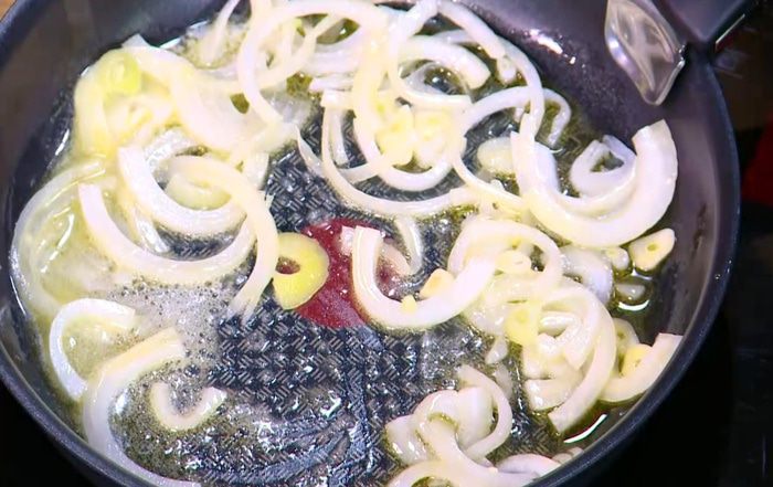 Разогреть в сковороде сливочное и оливковое масло и обжарить лук и чеснок до прозрачности.