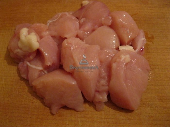Нарезанное куриное филе обжарить в горячем масле со специями.