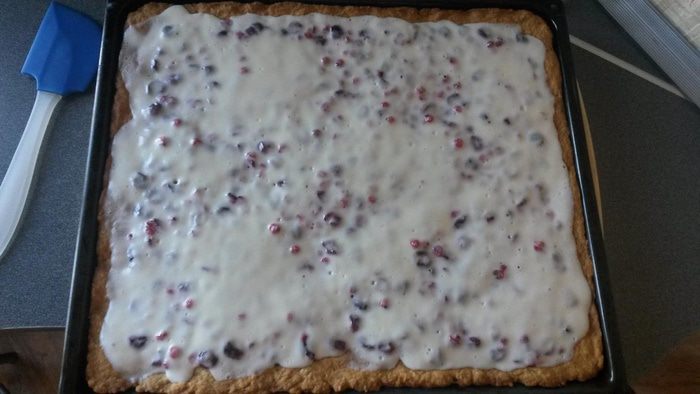 Выложить сверху бруснику (можно чуть-чуть сахаром присыпать сверху) и поставить в предварительно нагретую до 180°С духовку на 25 минут.