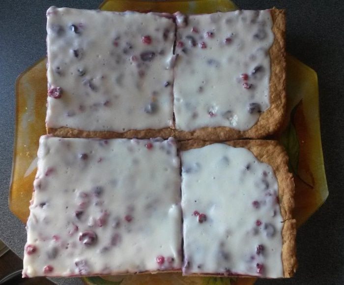 Ягоду можно брать любую абсолютно! Я пекла в этот раз из вишни и красной смородины, — вкуснота! Только замороженную ягоду, надо предварительно полностью оттаять в холодильнике (чтобы было меньше потери сока).