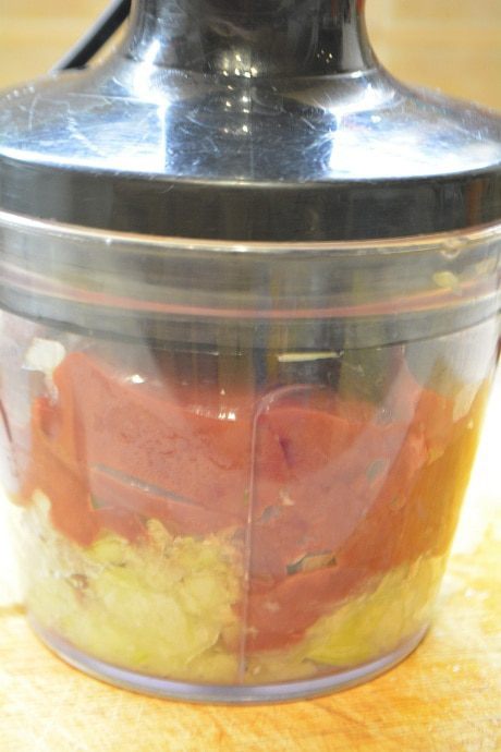 Печень помыть, обсушить и удалить пленки и жир при необходимости. Лук почистить и измельчить в блендере. К луку добавить печень и снова измельчить до однородного состояния.