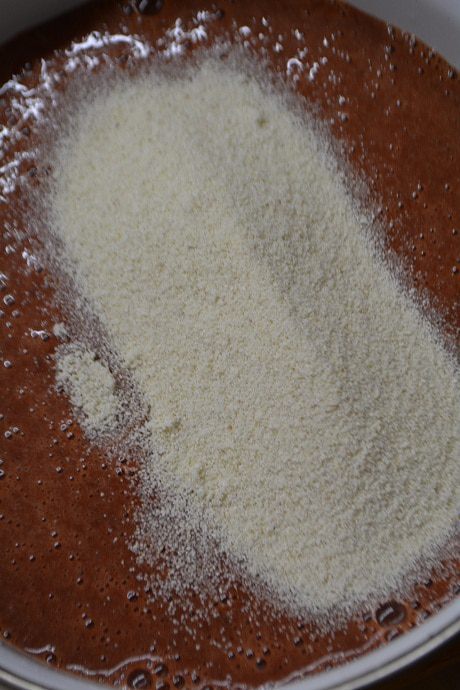 Перелить в глубокую чашку, добавить манную крупу, перемешать и дать постоять 40 минут, чтобы манка разбухла.