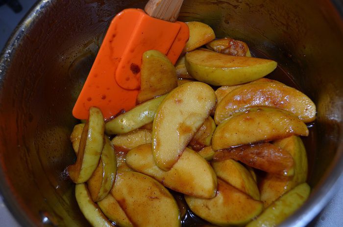 В карамель, что сделали выше со сливками, добавить корицу и нагреть. Вылить в смесь яиц и сахара, вернуть все в сотейник и, помешивая, сделать английский крем, доведя до 83°С.
