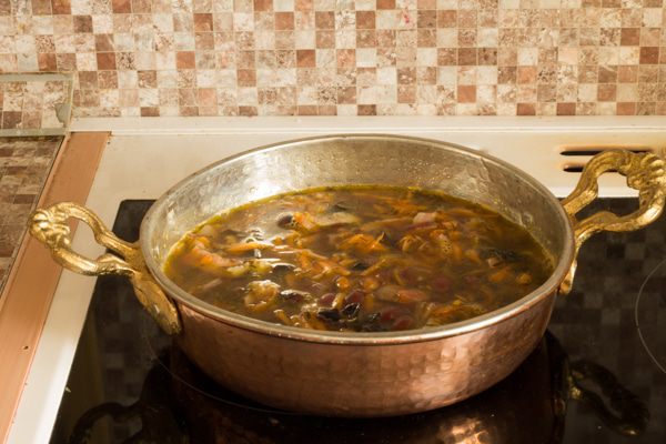 Добавить фасоль. Влить мясной бульон, посолить и довести до кипения. Переложить в кастрюлю с толстым дном, убавить огонь и протушить около часа.