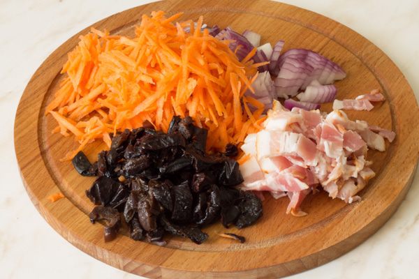 Морковь натереть на крупной терке. Лук, чернослив и бекон мелко нарубить.