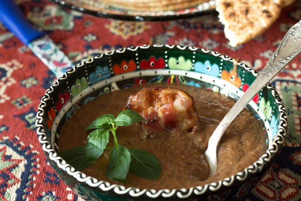 Подавать, украсив кусочком жареного бекона и зеленью. Не забудьте поставить на стол питу или другие хлебные лепешки, как это делают в Турции.
