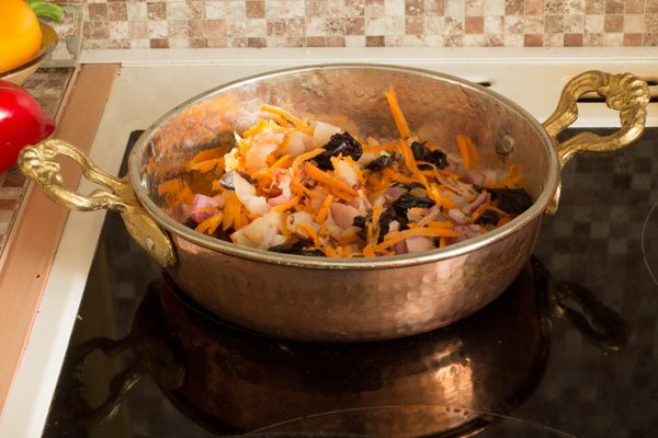 Обжарить бекон на растительном масле. Добавить лук, морковь, чернослив, специи. Все вместе перемешать и убавить огонь.