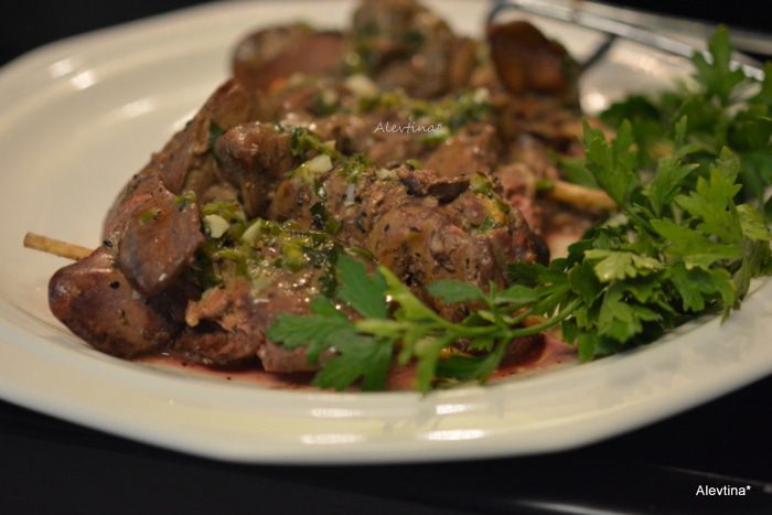 Готовые шпажки с печенью подаем с зеленью и под соусом из масла. Очень вкусное и нежное блюдо.