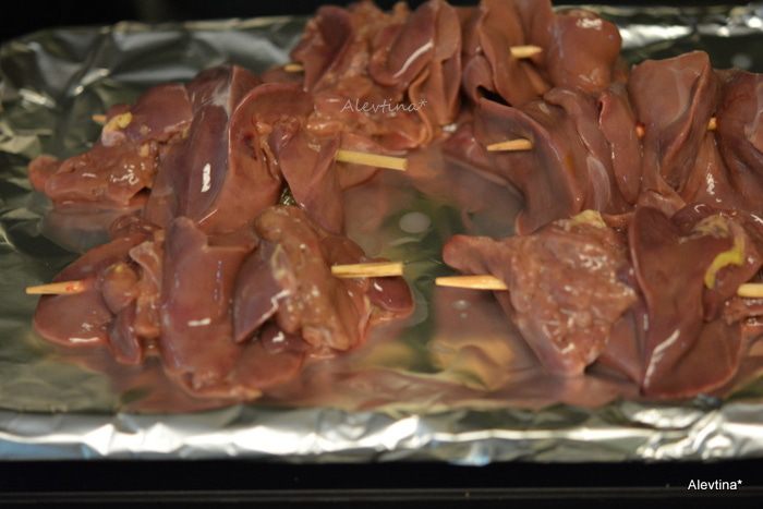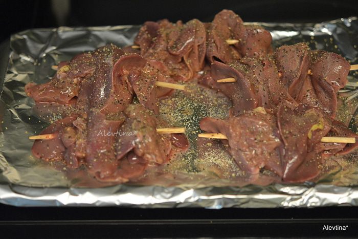 Куриную очищенную печень нанизать на шампуры.