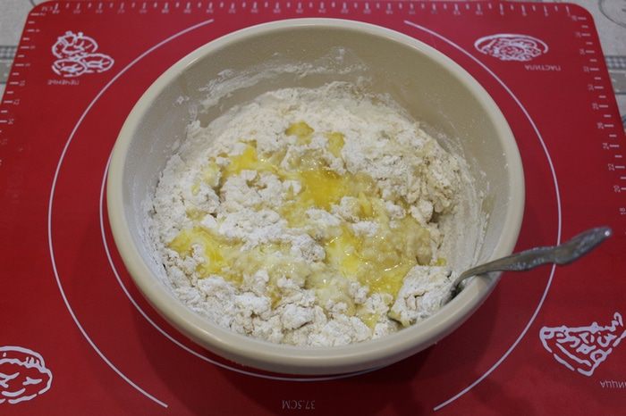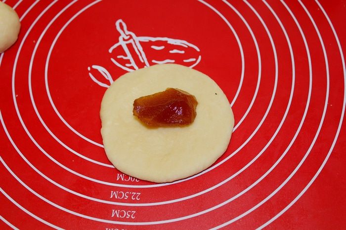 Растянуть колобок в лепешку, положить начинку.