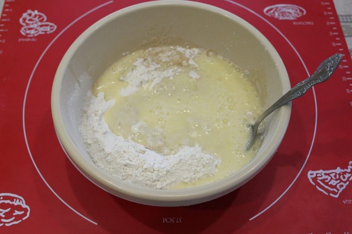 В чашку добавить слегка взбитые яйца.