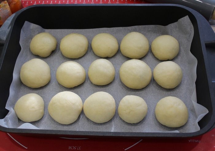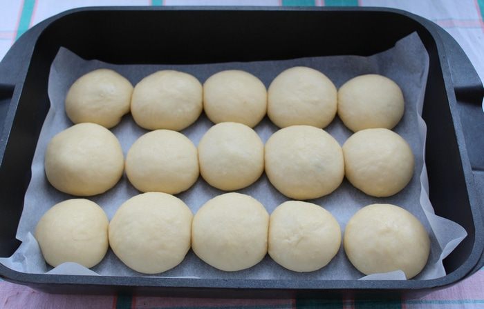 Форму для выпечки выложить пекарской бумагой, расположить булочки, оставляя расстояние между ними.