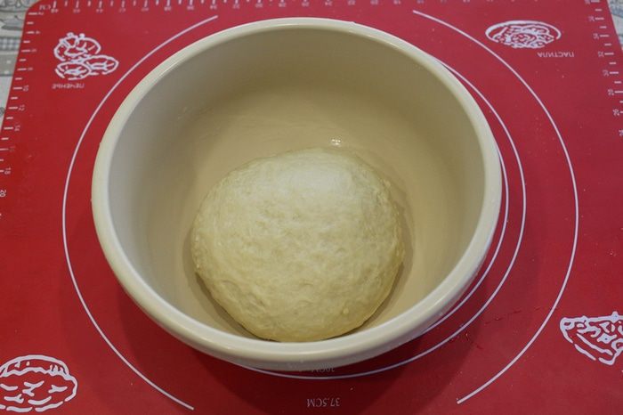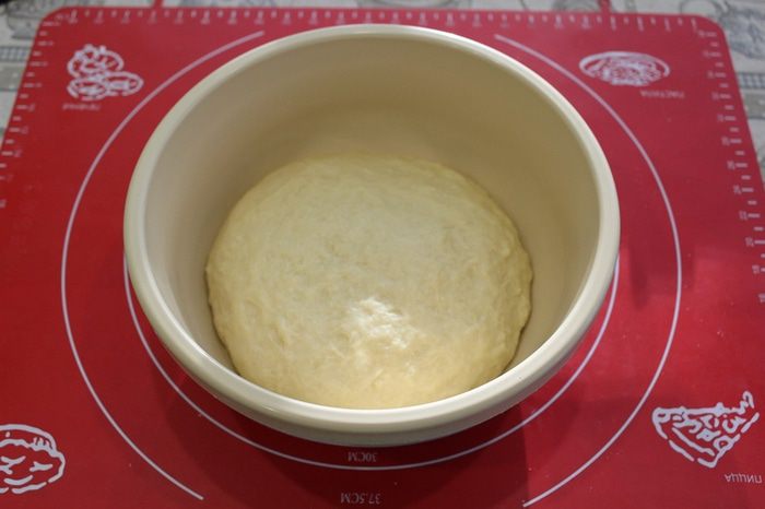 Замесить гладкое тесто, оно должно отставать от рук. Кладем тесто в смазанную растительным маслом чашку, накрыть и поставить в теплое место на один час.