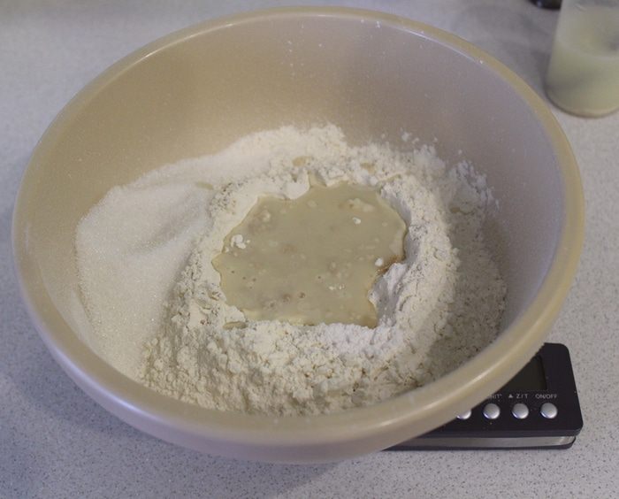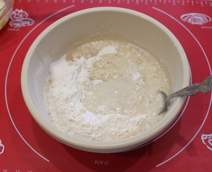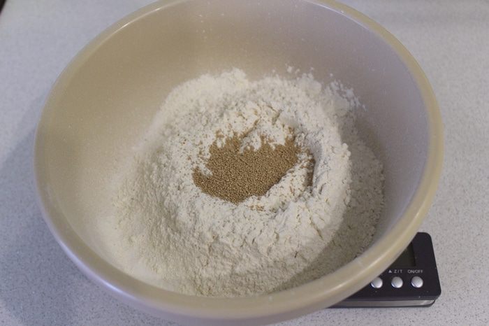 Просеять муку в чашку, добавить дрожжи, соль.